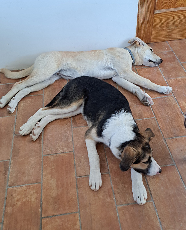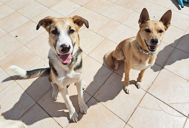 Die Beiden sind zu bildschönen großwerdenden Mixen herangewachsen. In ihnen könnte väterlicherseits ein Galgomix stecken. Ihr schlanker Wuchs und Agilität im Spielen lassen es vermuten.