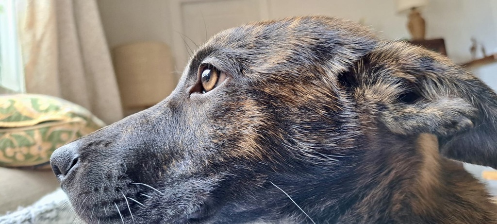 Sie ist absolut loyal und geht schon toll (bei Fuß) an der Leine. Matilda ist clever, lernt gut (sowohl das Positive als auch die Eigenarten der Großen). Sie ist ein bsoluter Traumhund, aber kommt langsam in die Pubertät. Die Hübschen kann die großen Ohren auch mal auf Durchzug stellen