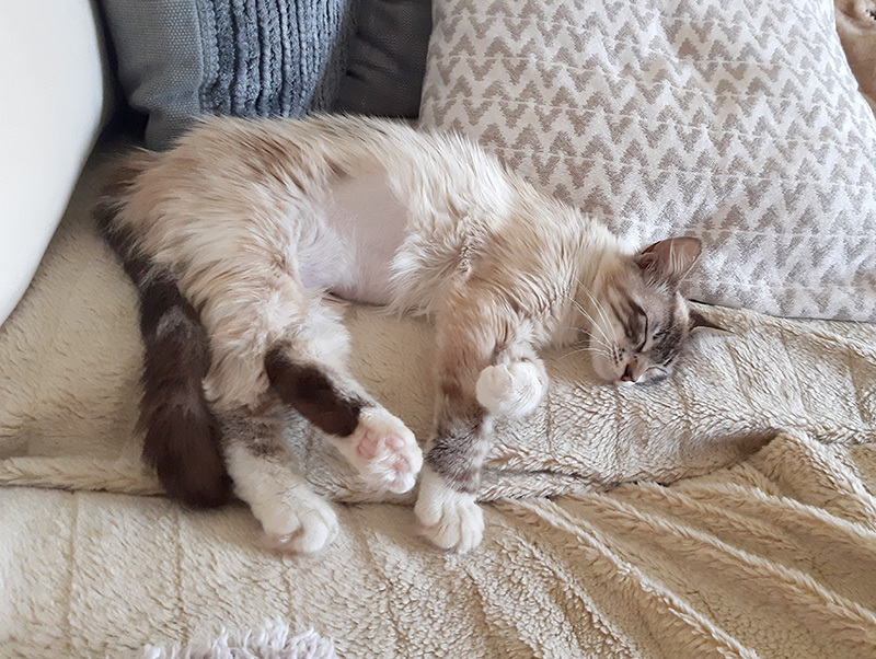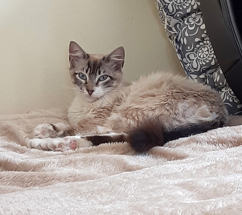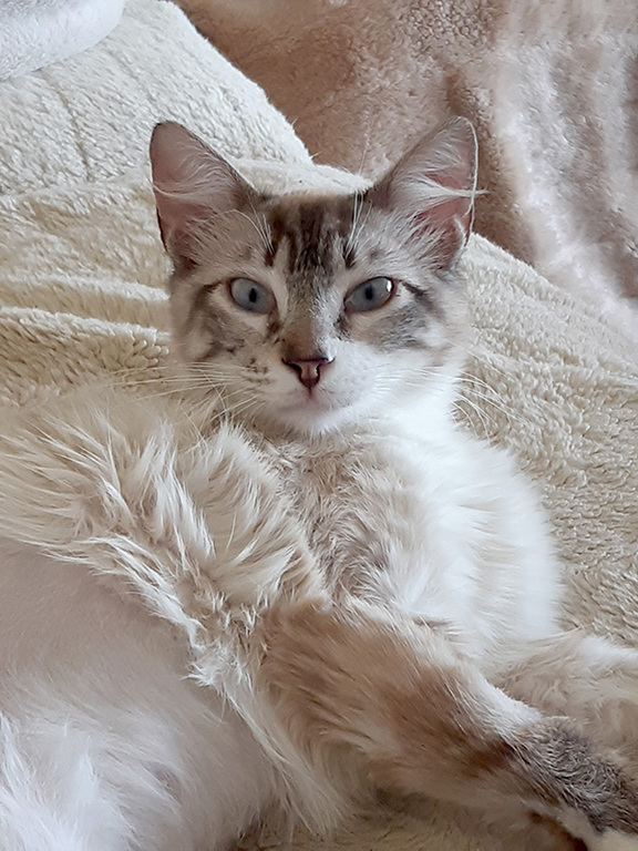 Die blauäugige Siammix-Schönheit Africa, von ihrem Pflegepapa liebevoll Fricky genannt, wurde im April 2020 geboren. Ihr cappuccino-farbenes Fell, die langen Haare in den Ohren und der buschige Schwanz machen sie schon rein optisch zu etwas ganz Besonderem.