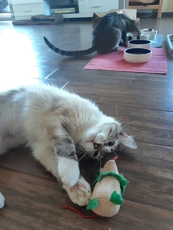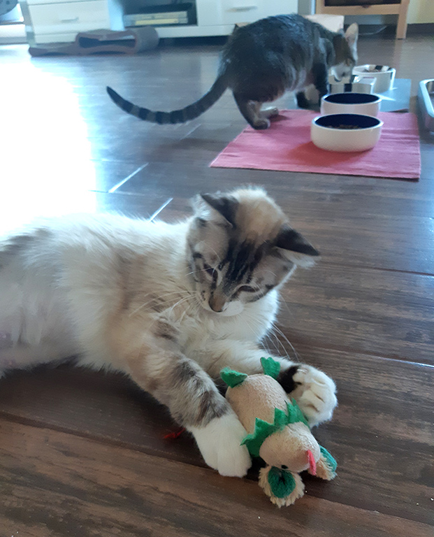 dahin ist aber ihre Freundin Fricky die Einzige, die sie auf Kuschelnähe heranlässt! Spielen kann man inzwischen aber auch mit dem Pflegepapa auf eine gewisse Distanz, die übrigens immer kleiner