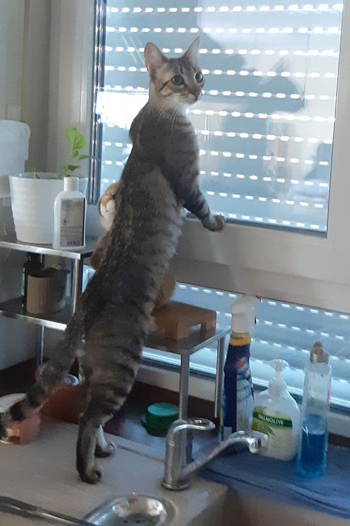 ausdrucksvollen bernsteinfarbenen Augen und tollen schwarzen Streifen im Fell. Sie ist im Gegensatz zu Fricky eher schüchtern und vorsichtig. Guindilla ist, wie ihre Freundin, neugierig und