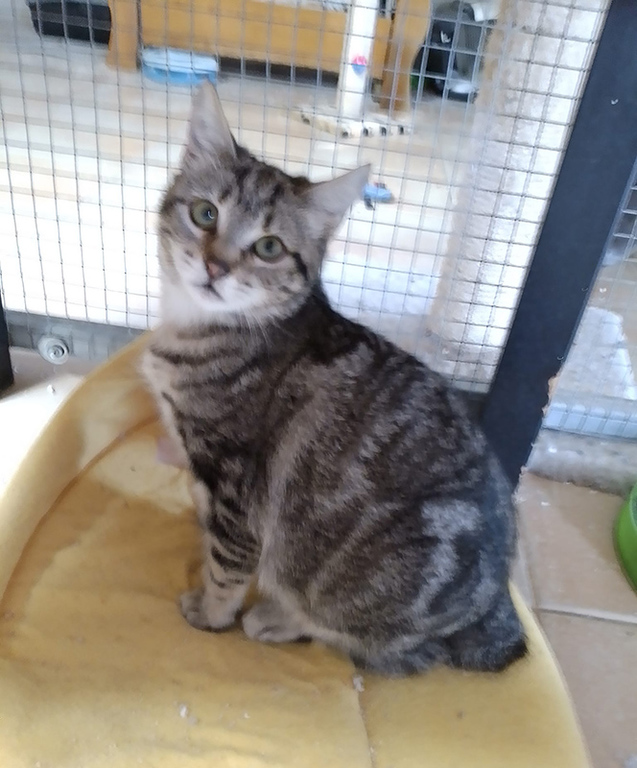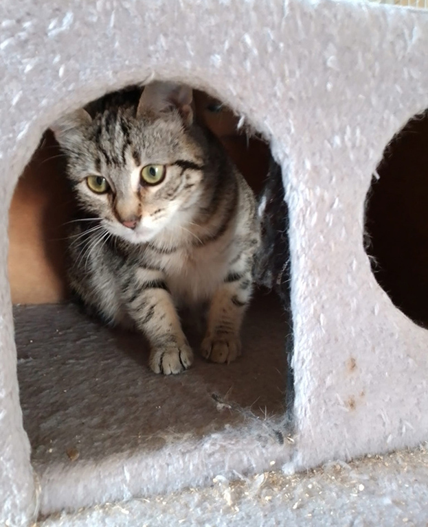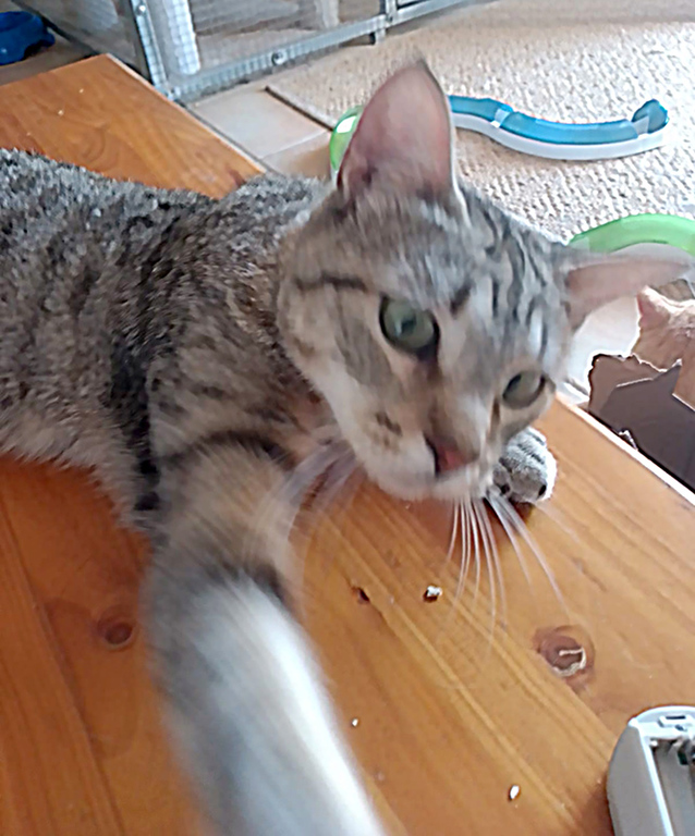 Angelo war anfangs der ‚Däumling‘ des Wurfes, inzwischen ist er jedoch ein stattlicher Kater geworden, der seine Schwester um einiges überragt. Er hat ein sehr hübsches Gesicht mit wachen Augen, das aber auch schon darauf schließen lässt, dass er es faustdick hinter den Ohren hat. Angelo ist ein kleiner Abenteurer und stets der Erste, wenn irgendwo eine Tür der anderen Gehege aufsteht… Alles wird sogleich auf Futter inspiziert und bei Erfolg auch gleich gefressen. Ebenso kreativ ist er, wenn es darum geht, Tüten oder Päckchen mit Futter zu öffnen. Aber er teilt auch gern, Paddy und seine Freunde bekommen stets auch etwas vom Büffet ab.