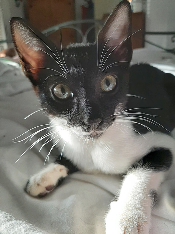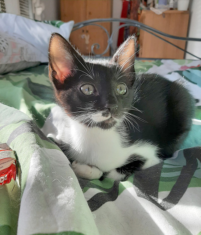 Jo und ihre Schwester wurden am 12.02.2022 geboren und mit nur vier Wochen ausgesetzt. Jemand fand sie und brachte sie in die nächste Tierarztpraxis. Das eine Kitten wurde dort vom Fleck weg adoptiert, das andere Kitten, damals noch ein vermeintlicher „Kater“, wurde bei Jayne in Pflege gegeben. Jo war damals winzig und bestand fast nur aus Ohren und Kopf, der Körper und die knochigen Beinchen sahen aus, als sei Jo eine Fledermaus, zudem hatte irgendjemand dem armen Kitten die Augenbrauen und die Schnurrbarthaare geschnitten.