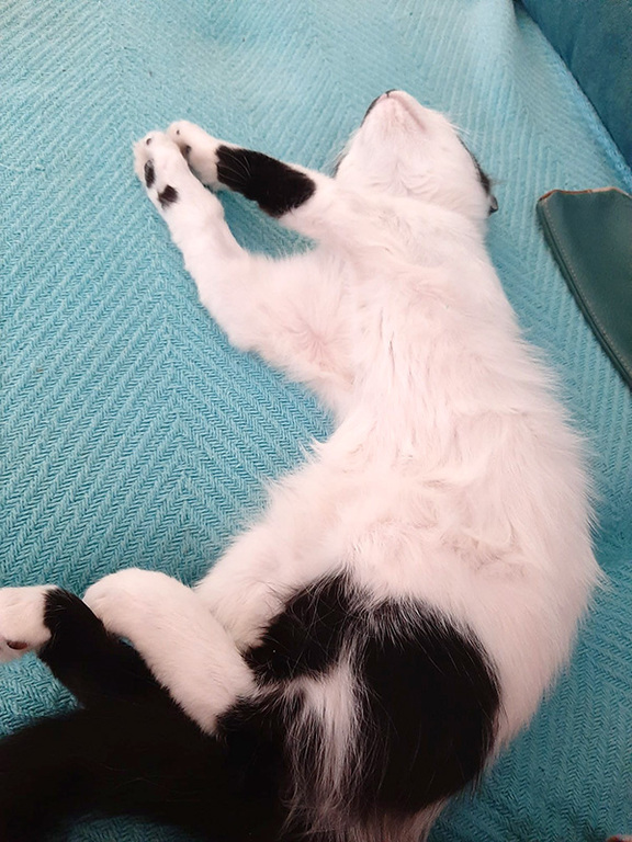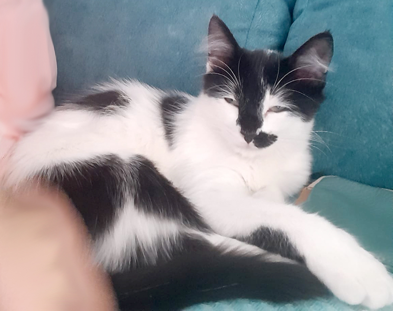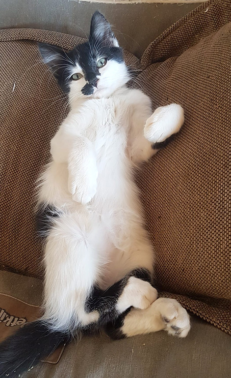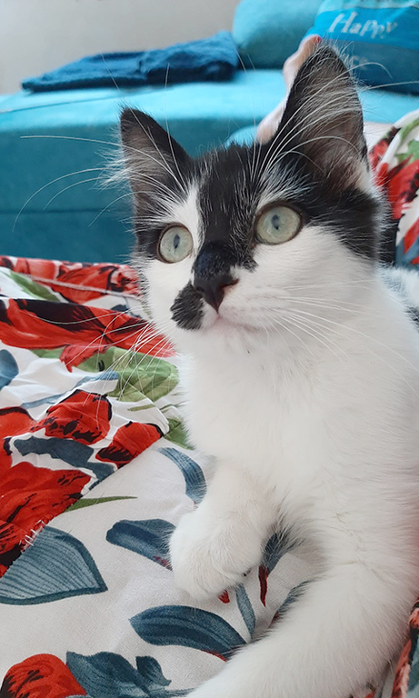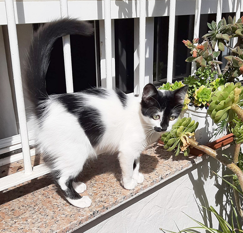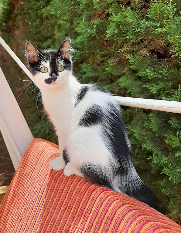 Die niedliche Schwarzweiße mit dem seidigen, halblangen Fell wurde in einem kleinen Küstenort in Südspanien gefunden. Eine Spanierin hält seit Jahren Katzen, die sie nicht kastrieren lässt und die natürlich mehrfach im Jahr Junge bekommen. Jegliche Hilfsangebote wurden bisher ausgeschlagen. Sobald die Kitten dann beginnen, Nassfutter zu fressen, werden sie ausgesetzt. Von dem Aprilwurf hat vermutlich nur die kleine Dotty überlebt. Dotty war circa vier Wochen alt und saß schreiend unter einem Busch, als ein tierlieber Mann sie fand und aufnahm.