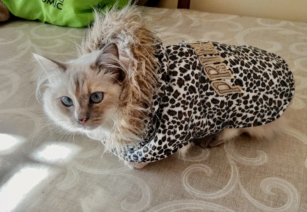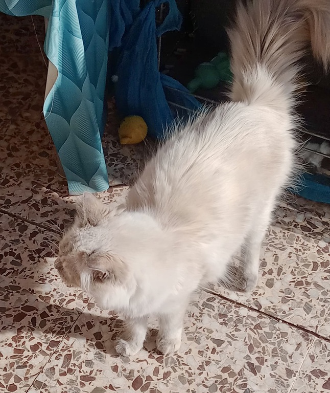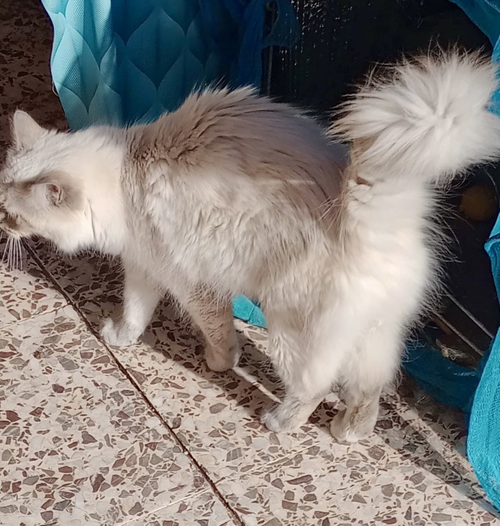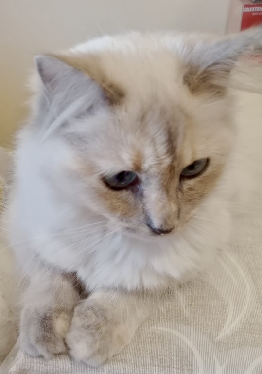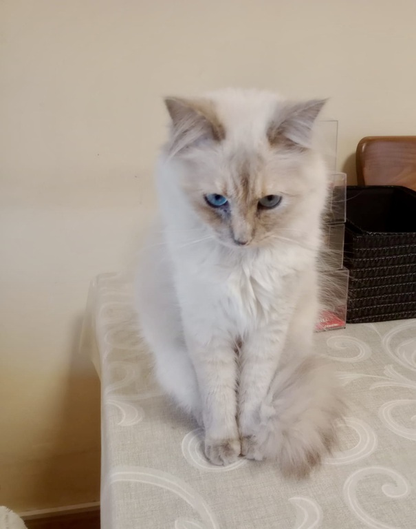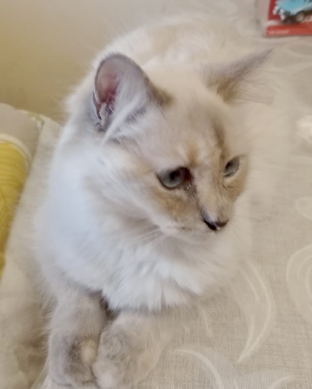 Wir vermuten, dass unter Emis Vorfahren eine Heilige Birmakatze war. Das halblange Fell, welches jeden Tag schöner wird, sowie die typische dunkle Pointierung an Nase und Ohren, sprechen dafür.