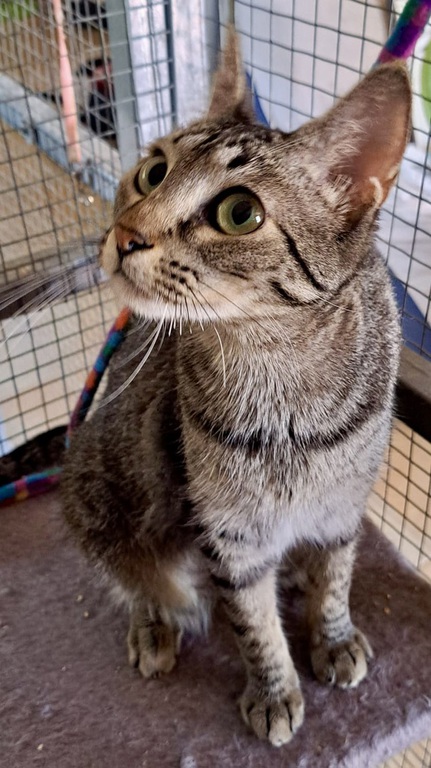 Das gestromte Tigermädchen wurde vermutlich Mitte März 2023 geboren. Sie wurde als Minikitten wurde mit knapp drei !!! Wochen von einer Familie für die jungen Kinder angeschafft. Aber das Interesse für das neuen Spielzeug ließ sehr schnell nach, sodass Baby Hilde allein bei Hühnern im Verschlag geparkt wurde. Eine spanische Tierschutzfreundin hat es irgendwie geschafft, Hilde den Leuten abzuschwatzen. So zog Hilde in unsere Cattery ein und hat sich nach anfänglichen gesundheitlichen Problemen sehr gut entwickelt. Hilde ist ein sehr liebevolles Mädchen, sehr verspielt, sehr sozial. Sie kommt auch mit allen anderen Katzen gut klar.