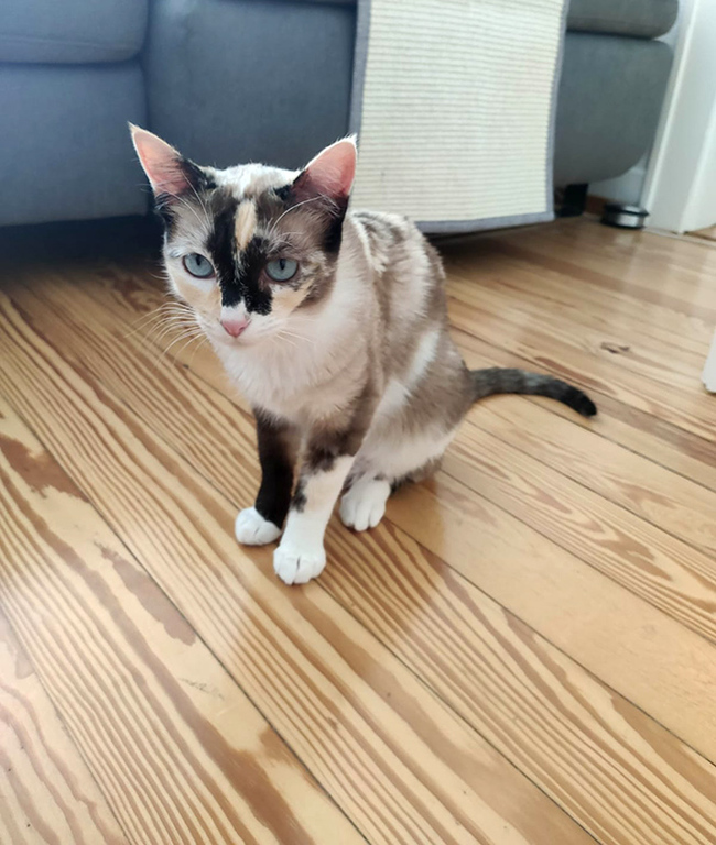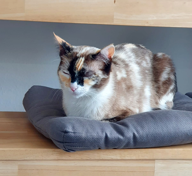 Trotz des hohen Siamanteils besitzt Luquita eher ein ruhiges Naturell. Ihre Lieblingsorte für ausgiebige Nickerchen sind weiche Plätze in der Sonne auf dem Balkon. Auch etwas geschützte Rückzugsorte wie eine Höhle nimmt sie gerne für sich in Anspruch.