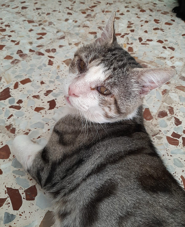 Unsere Tierärztin schätzte ihn auf circa 5 Jahre, sie behandelte seine Wunden, die entzündeten Augen und das lädierte Zahnfleisch. Wie leider erwartet war O’Malley auf FIV positiv, der FeLV Test fiel zum Glück negativ aus.