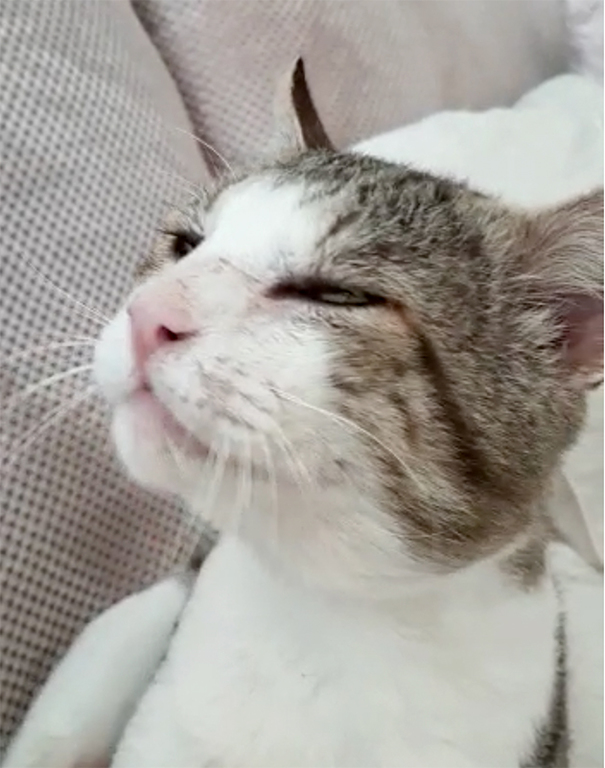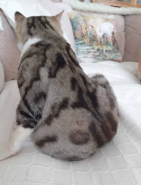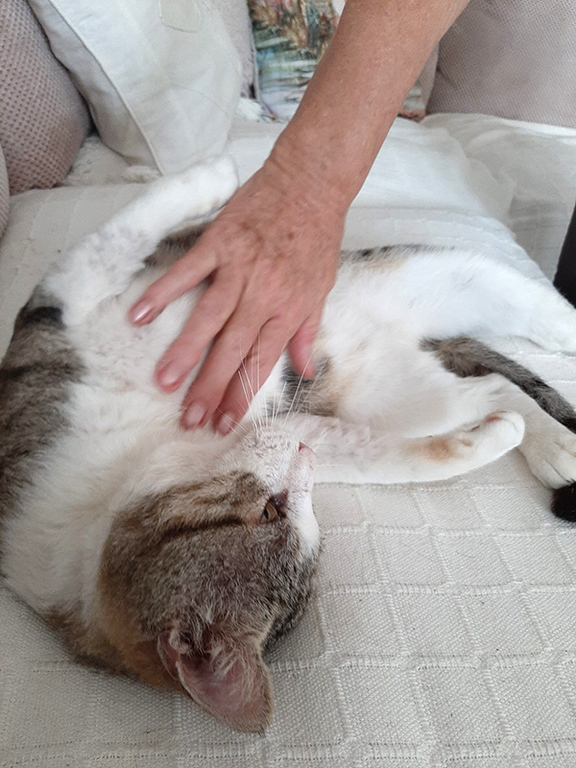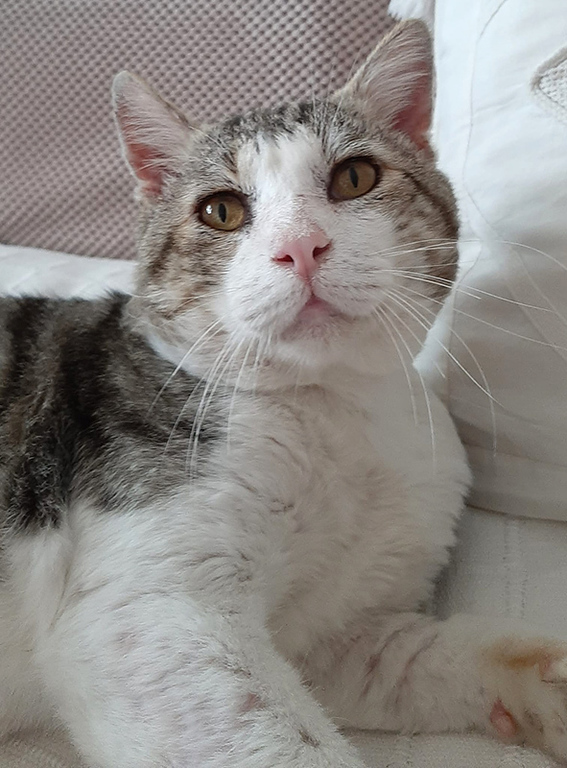 Leider halfen diese nur postiven Eigenschaften dem Kater wenig, denn seine ehemaligen Besitzer haben ihn vermutlich erbarmungslos vor die Tür gesetzt. Er musste sich lange auf der für ihn ungewohnten und feindseligen Straße durchschlagen, bis ihn sein Weg zu unserer Tierschutzfreundin Ann führte. Er zog dort Mitte September 2022 wie selbstverständlich ein und machte es sich gemütlich.