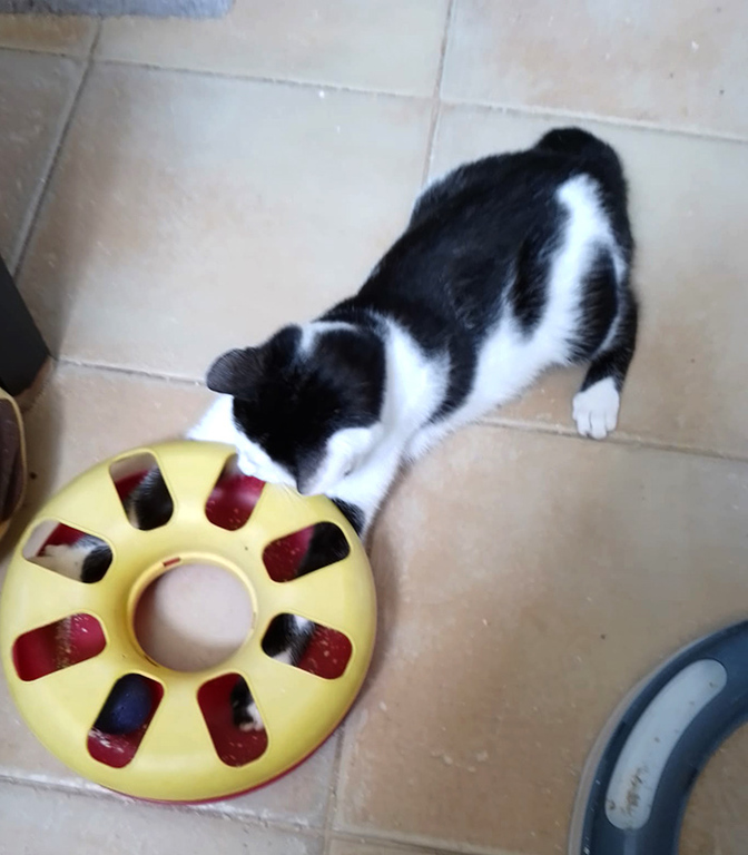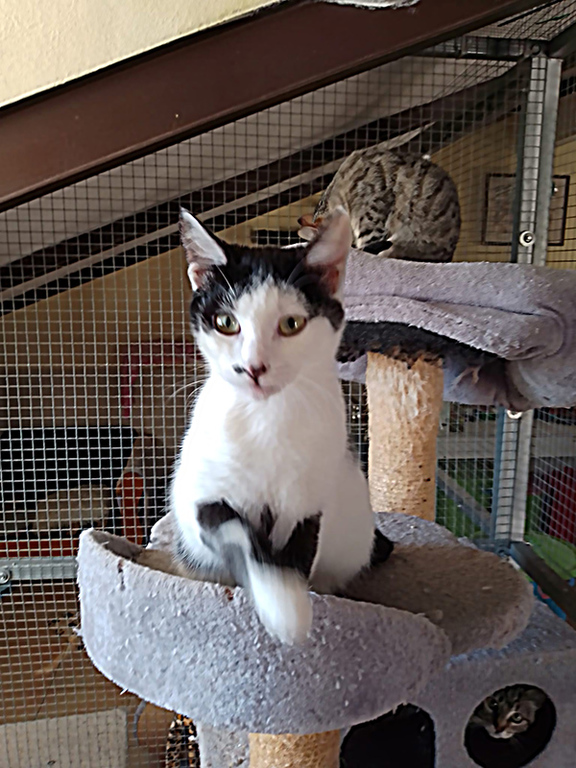 Der quirlige Poirot und seine drei Geschwister Paddy, Angelo und Phoebe wurden schätzungsweise Anfang September geboren. Wenige Wochen später hatte man sie an einer Straße ausgesetzt, zu fünft. Eine tierliebe Britin entdeckte die Kleinen, konnte sie aber nicht sogleich mitnehmen, weil sie mehrere Hunde hat. Als am nächsten Tag jedoch bereits eins der Kitten nicht mehr da war, sammelte sie die Kleinen ein. Die Situation mit sechs Hunden, die keinerlei Katzen gewohnt sind, war jedoch nicht tragbar, so landeten die ‚fabulous Four‘ in unserer Obhut.