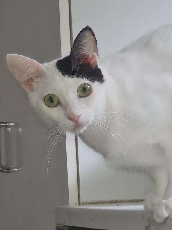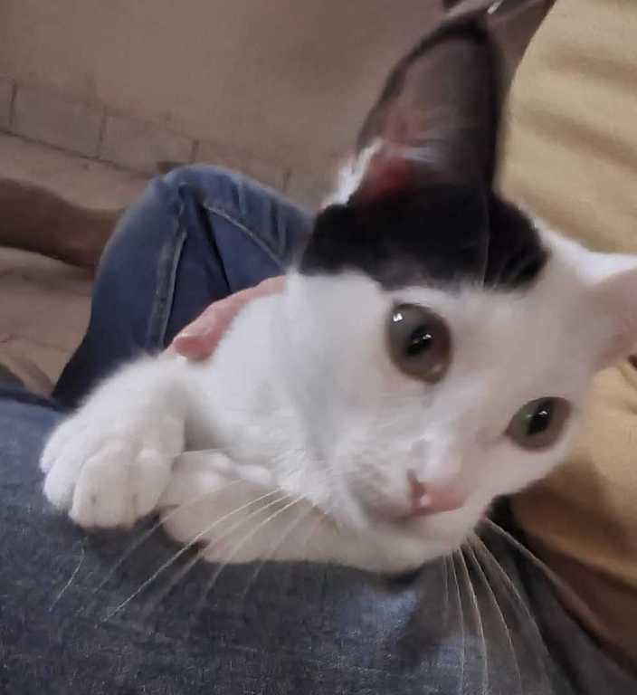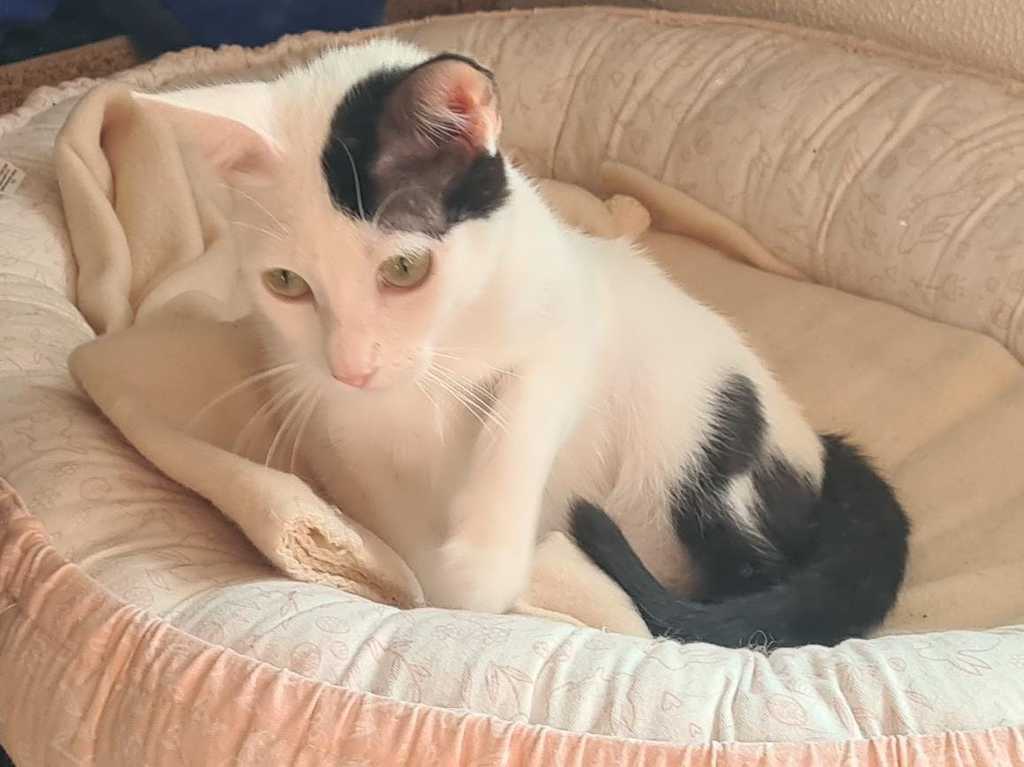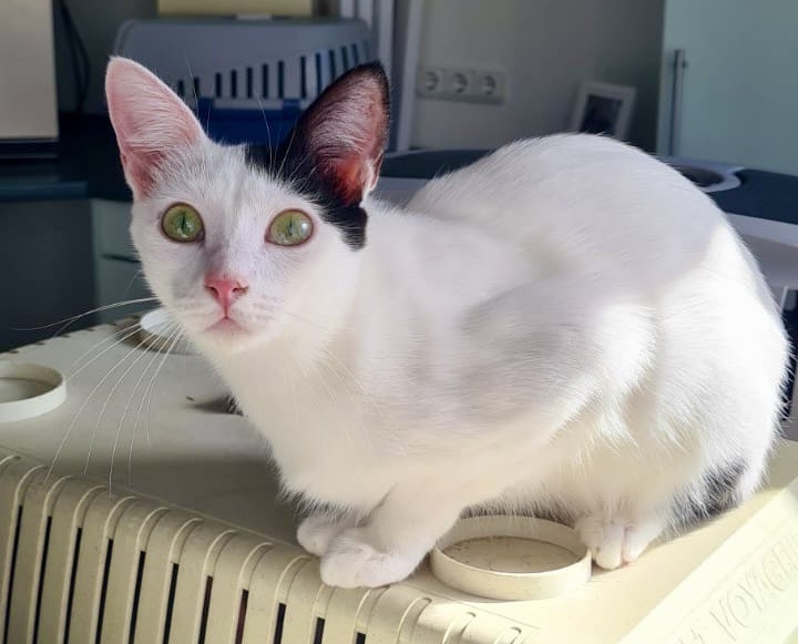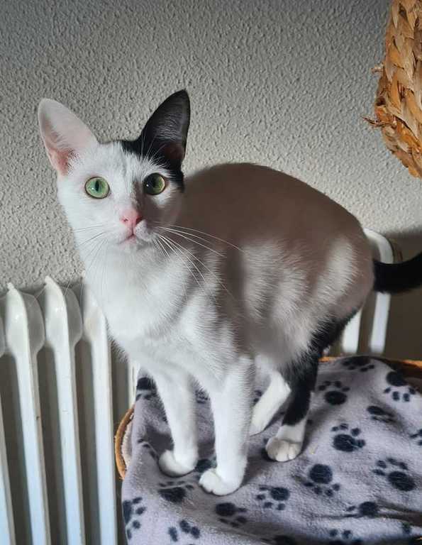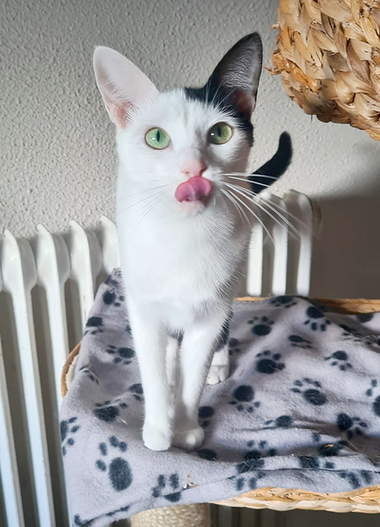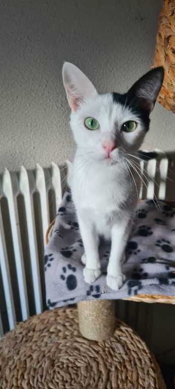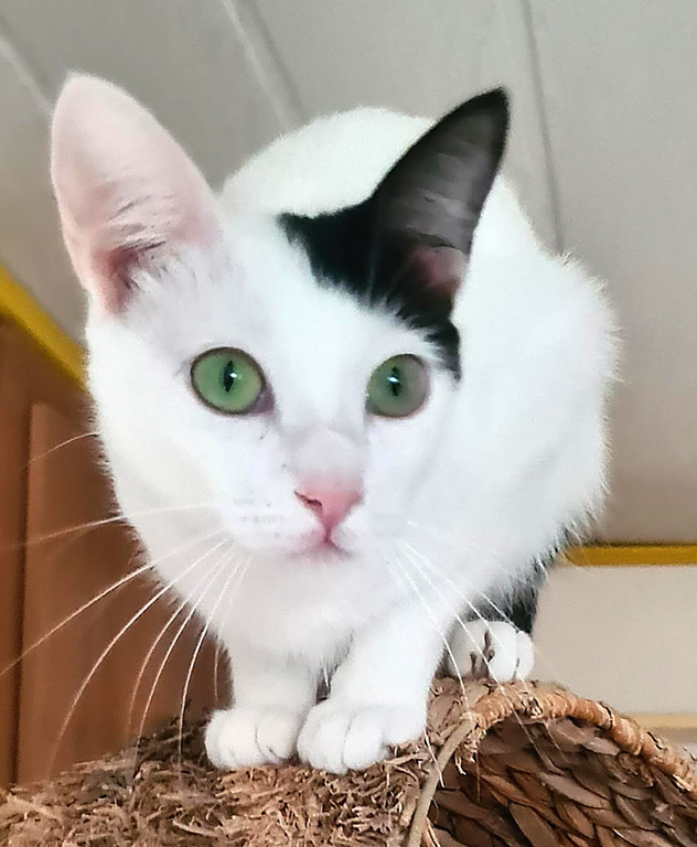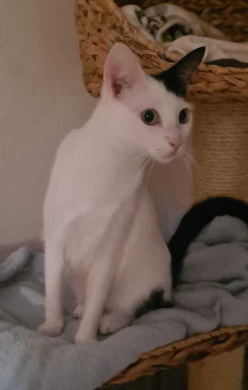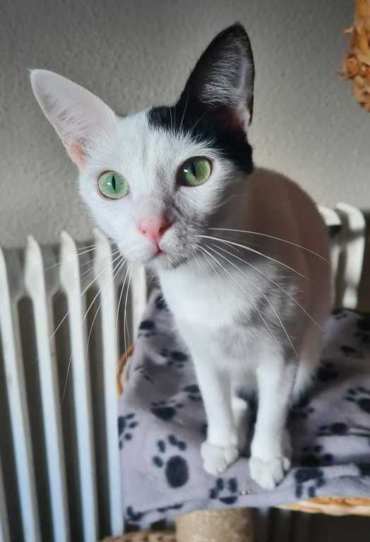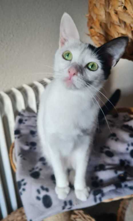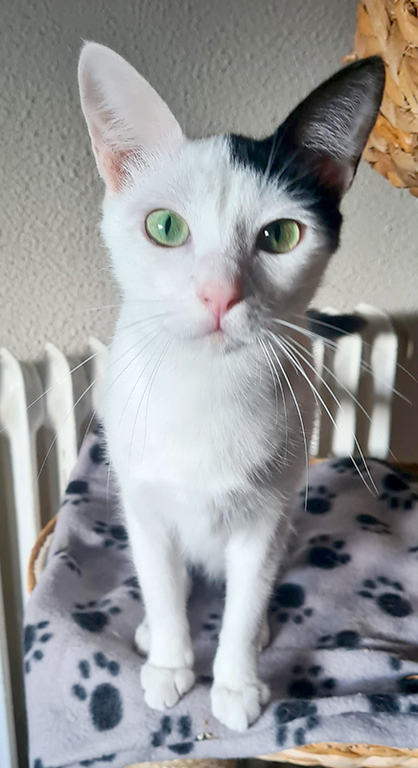 Die weissschwarze Yoda mit dem schwarzen Ohr bekam den Namen, weil sie schon als Baby so weise war und gleich wusste, dass ihre Pflegemama gut zu ihr ist. Sie war von Anfang an zahm und sehr schmusig. Zudem hatte sie als Winzling enorme Ohren... Eine Traumkatze. Es gab ein tägliches Ritual: wenn ihre Pflegemama in das Katzenhehege ging, kletterte Yoda an der Tür hoch, sie pflückte sie herunter, knuddelte sie und setzte sie dann wieder ab. Sie liebte das. Yoda braucht sehr viel Streicheleinheiten und Berührung, kann aber auch wie eine Irre spielen.