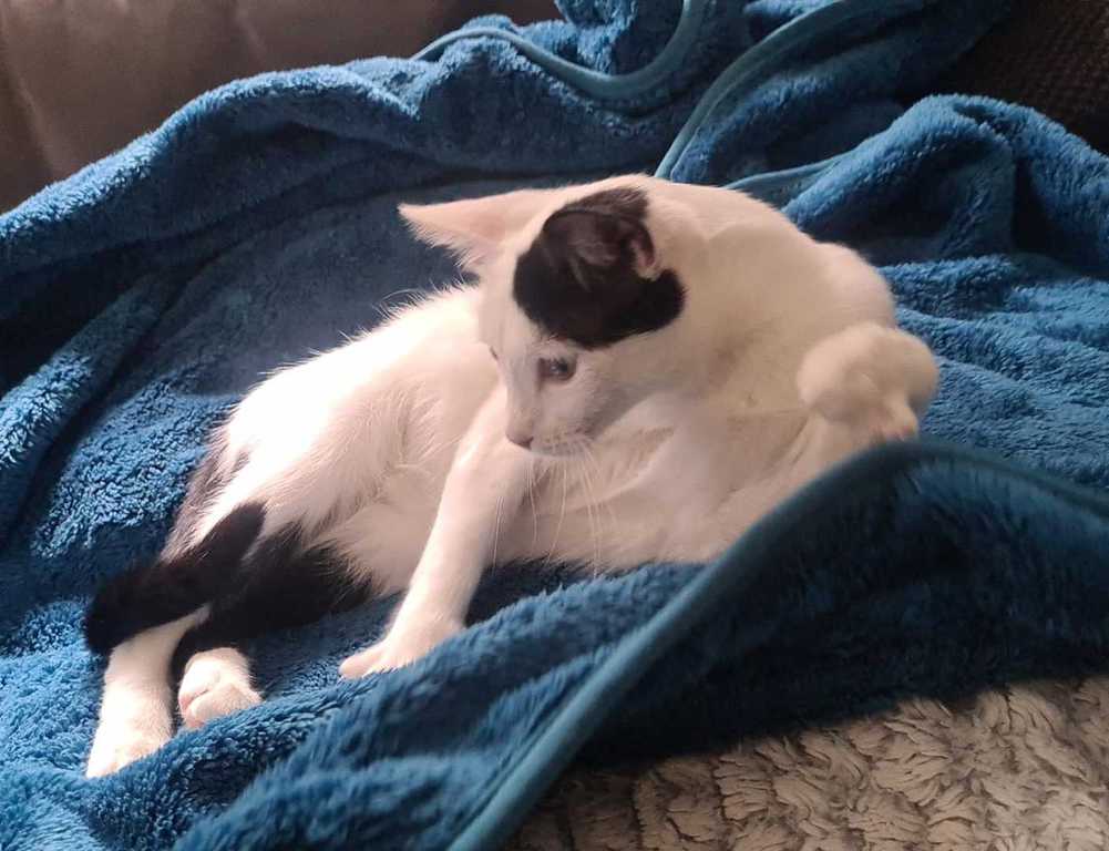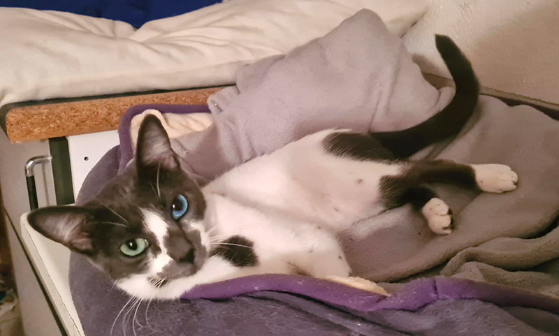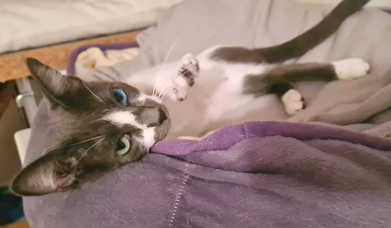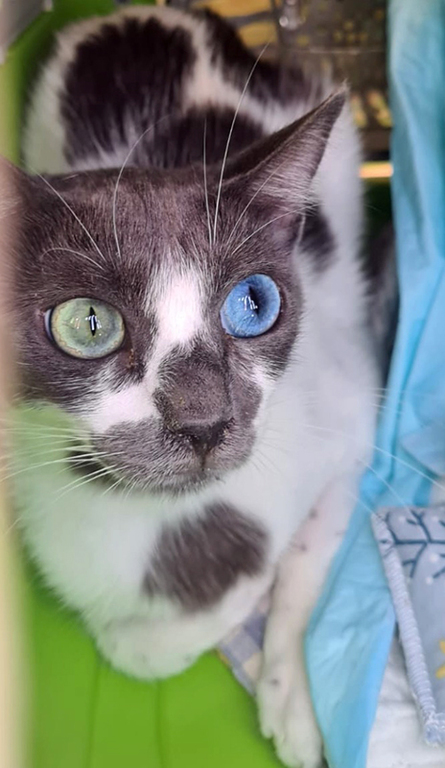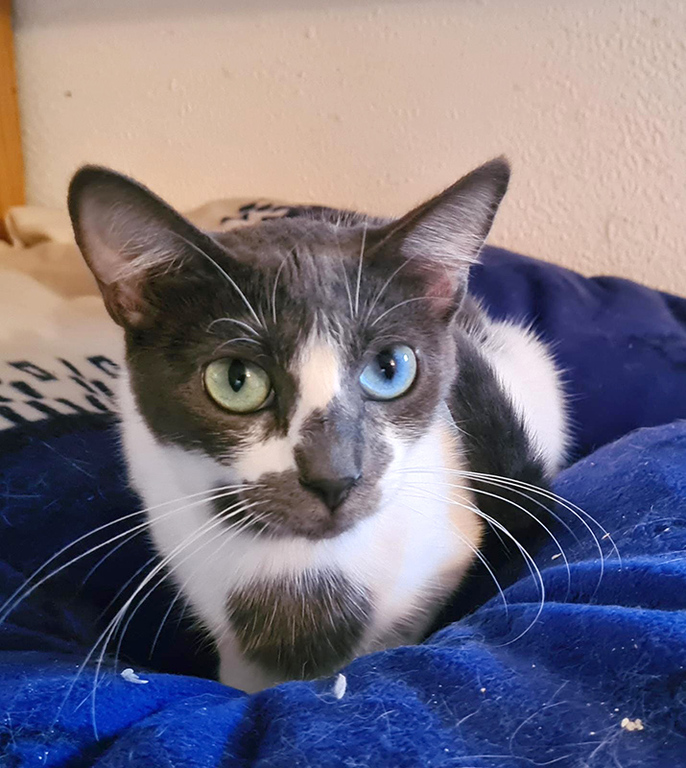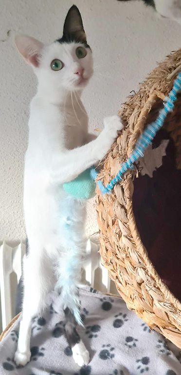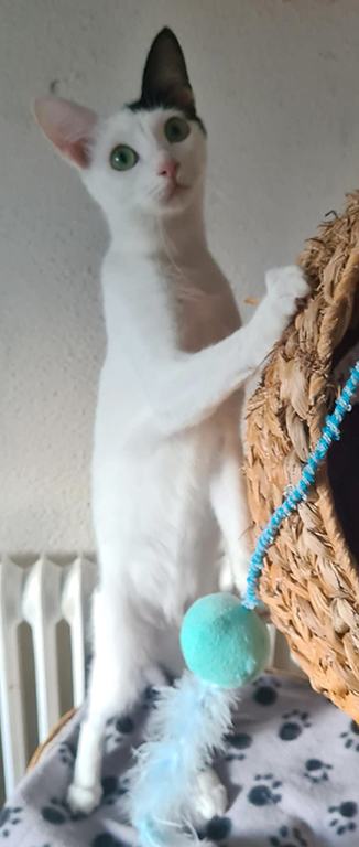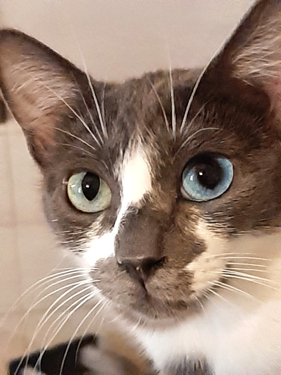 Schwester (Blue) Bayou ist eine sogenannte „Odd-eyed“ Katze, ihr Markenzeichen sind zwei unterschiedlich gefärbte Augen. Dazu ist die Musterung ihres Gesichtes ungewöhnlich. Bayou brauchte am längsten, bis sie Vertrauen gefasst hatte. Sie ist irre verspielt, anfangs war sie wie ein Kater. Bayou war immer ähnlich wie die Mutter, sie wollte eigentlich gestreichelt werden, aber dann war sie doch nicht gänzlich überzeugt, dass ihr wirklich nichts dabei passiert...